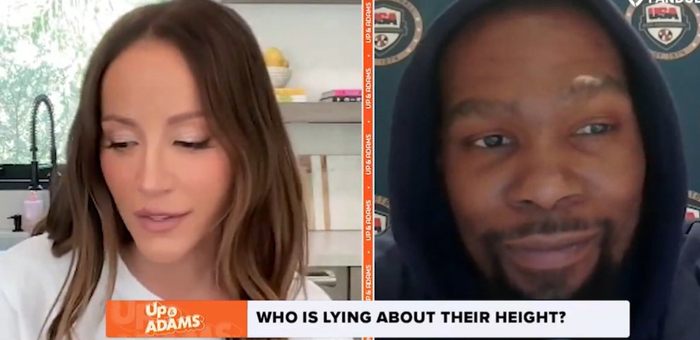 直播吧07月11日讯 杜兰特在接受美女记者Kay Adams的采访时,回应了有关自己身高的问题。