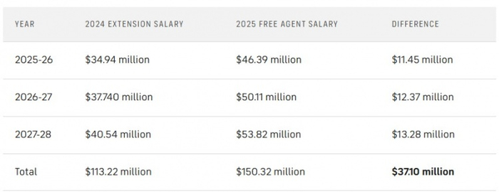 这可能会影响球星们以后的决定。NBA的薪水增长如此之快,由于联盟预计每年都会有10%的薪资涨幅,对于最好的那些球员来说,优先考虑入袋为安而不是去尽可能签下大合同,可能会更有意义。6000万美元和7000万美元的差距,是否能足以让你等多一年呢?球星们会选择签下80%或90%的顶薪,来最大化他们争冠的可能性吗?每个人都有自己的想法,但这个想法是合理的。