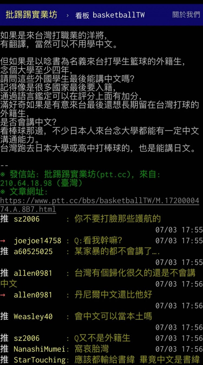 于是远渡重洋、在台湾高校打满数年的外国球员瞬间愤怒了(虽然很多人读书这几年钱也没少拿)。8名外籍生在7月2号发表联合声明,反对新联盟规定,还在试训现场联合抗议,局势顿时尴尬了起来。