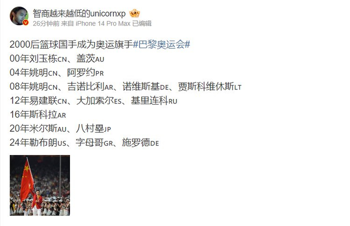 欧洲篮球及NBA选秀专家王健列出了2000后篮球国手成为奥运旗手的名单,具体如下: