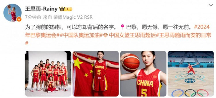王思雨配文写道:“为了胸前的旗帜,可以忘却背后的名字。📍巴黎,愿无憾、愿一往无前。”