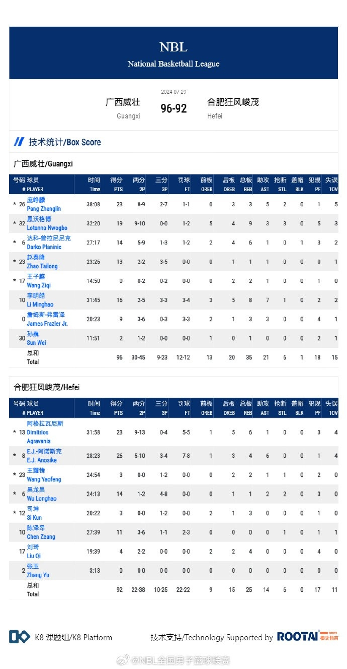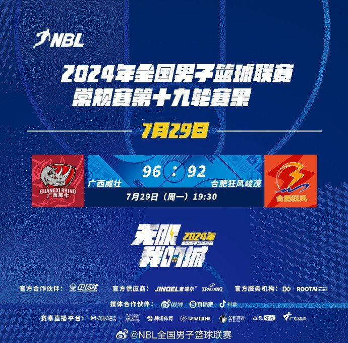NBL赛果:广西威壮96-92险胜合肥狂风峻茂 庞峥麟砍23分3板5助2断