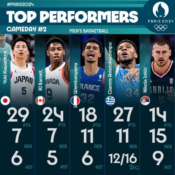 直播吧8月1日讯 今天,FIBA官方评选出了奥运男篮第2比赛日最佳阵容,入选的5名球员分别是河村勇辉(日本)、巴雷特(加拿大)、文班亚马(法国)、字母哥(希腊)、约基奇(塞尔维亚)。
