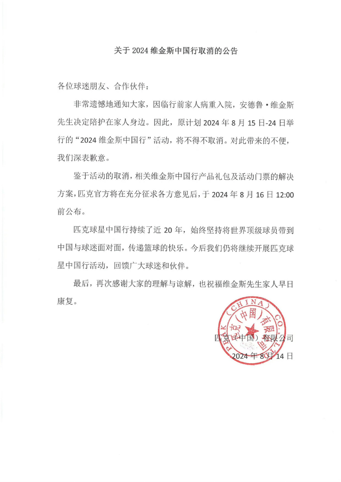 直播吧08月14日讯 维金斯经纪人今日表示,因家人病重入院,维金斯将不得不取消原定于8月15日-24日举行的“维金斯中国行”活动。