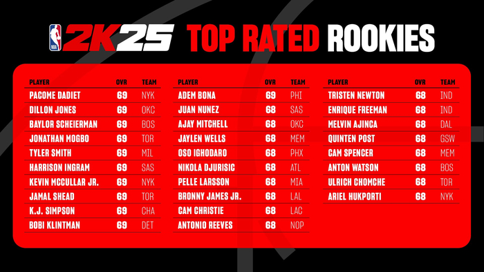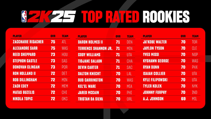 2K25新秀能力值:状元&榜眼75 谢泼德73 扎克-埃迪72 布朗尼68