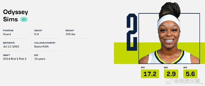 奥德赛-西姆斯,美国籍,身高172CM,司职后卫,本赛季效力于WNBA的达拉斯飞翼队,场均可以得到17.2分5.6次助攻,是球队的核心之一。