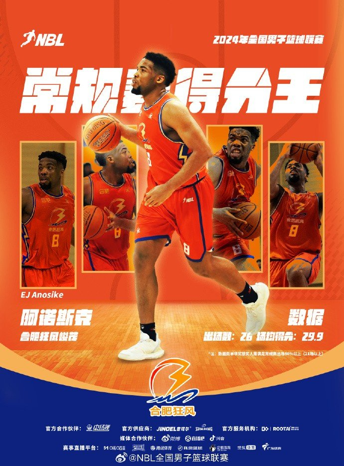 NBL联赛常规赛得分王:合肥狂风峻茂外援阿诺斯克 场均29.9分
