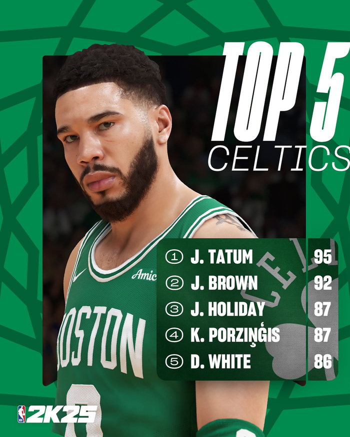 联盟最强首发?2K晒卫冕冠军凯尔特人能力值Top5:最低怀特86