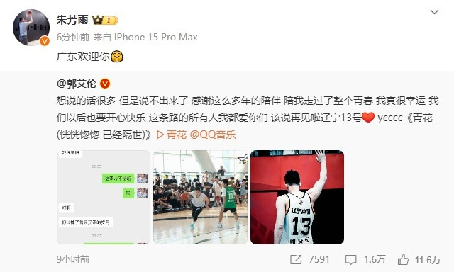 照抄杜锋的😅朱芳雨发博欢迎郭艾伦:广东欢迎你🤗