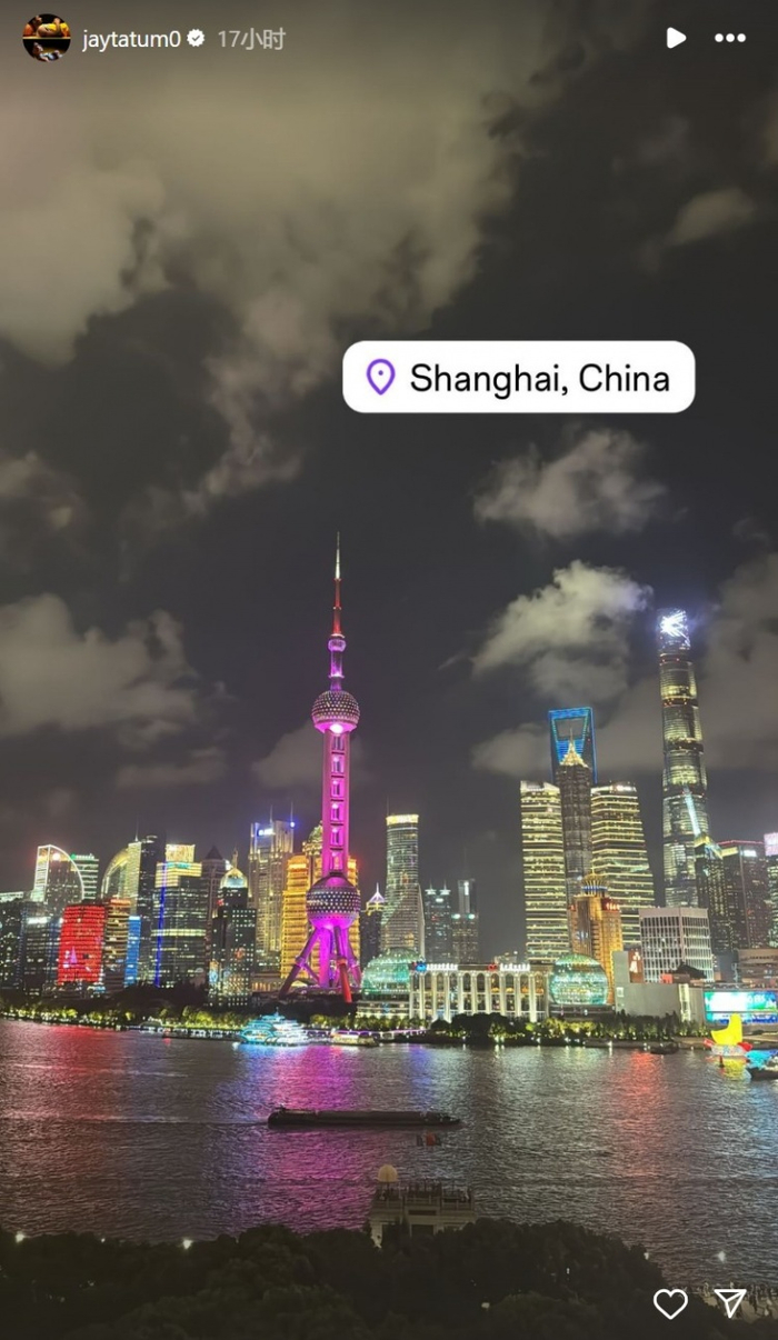 塔图姆在INS上晒出了上海陆家嘴的夜景,定位是中国上海。