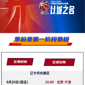 2024-2025赛季CBA联赛季前赛第一阶段赛程出炉!季前赛第一阶段将于9月20-22日在辽宁丹东、福建晋江、宁夏银川、山西晋城、江苏徐州五个赛区同时举行,20支球队将分为五组进行比赛,每组四支球队。