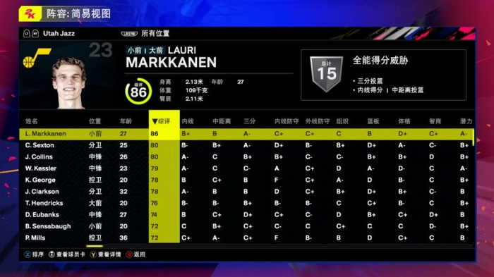 爵士全队2K25能力值:马尔卡宁86 科林斯80 凯斯勒79 克拉克森78