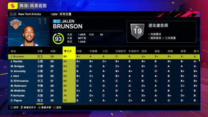 尼克斯全队2K25能力值:布伦森93 兰德尔85 大桥&阿努诺比84