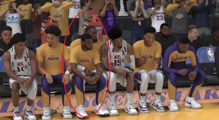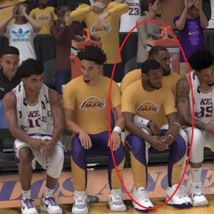 这是穿模了吧?NBA2K25场边的布朗尼直接坐在詹姆斯身上了...