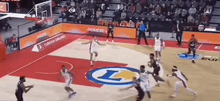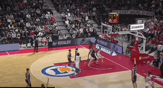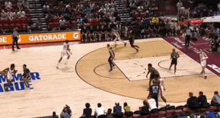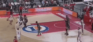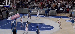 从战术角度来说,里萨谢以内线体型跑外线战术,其错位价值不言而喻。限于体型,他的防守人总会被掩护墙干扰,就算追到身边,也很难防住他的出手。里萨谢只要接球,就能在对手防线上划开一道小口子。就像下面这个回合,防守人拼命想追上里萨谢,可他一个卷切,直接晃掉了对手,中锋补位为时已晚,里萨谢和掩护墙同时内切,让对方中锋顾此失彼——