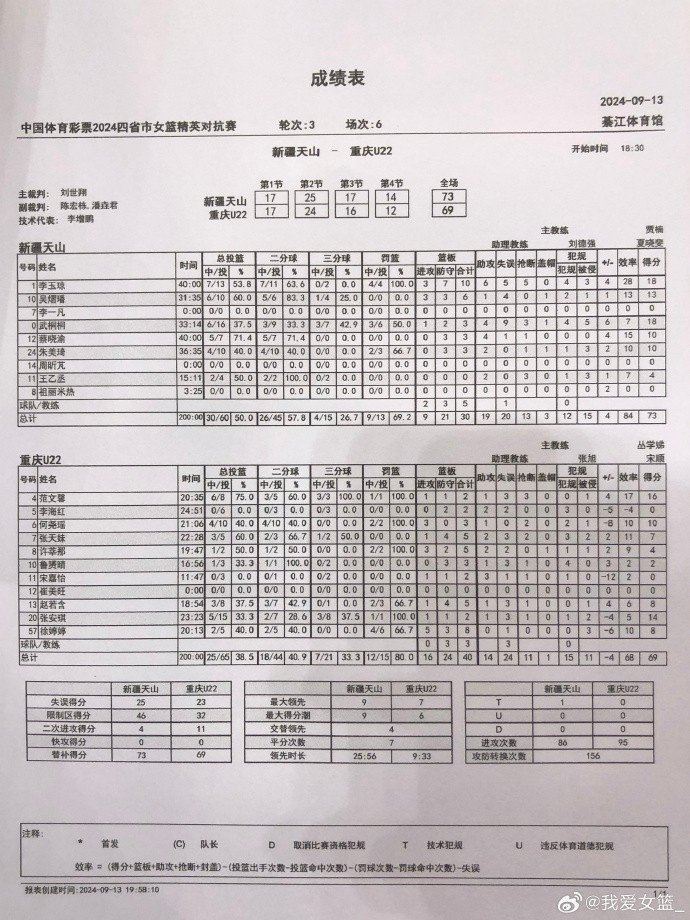 新疆天山73-69重庆U22队。新疆天山李玉琼打满全场,砍下18分10篮板两双,武桐桐18分,吴熠璠13分。重庆U22队范文馨空砍16分。