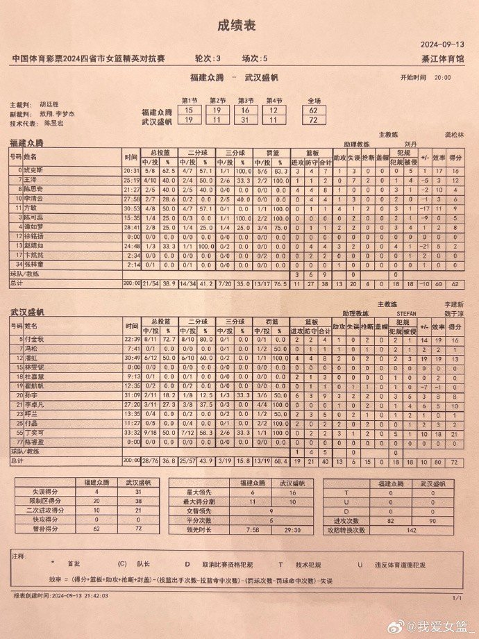武汉盛帆72-62福建众腾。武汉盛帆丁奕可得到全场最高的21分,付金秋16分,潘虹13分8篮板,小将李卓凡10分。福建众腾外援班克斯16分7篮板,王泽12分。