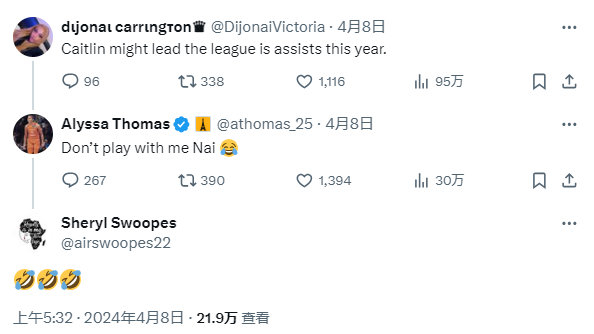 该评论出自太阳球员迪琼娜-卡灵顿今年NCAA决赛进行中发布的推文,她当时发文写道“凯特琳可能会在今年领跑WNBA助攻榜”,她的队友、当时刚刚打破单赛季助攻数纪录的艾丽莎-托马斯在推文下方回复:“严肃点、别开玩笑了。”谢莉-斯伍普斯则连发三个笑哭的表情。