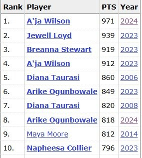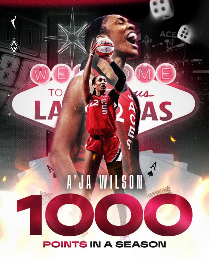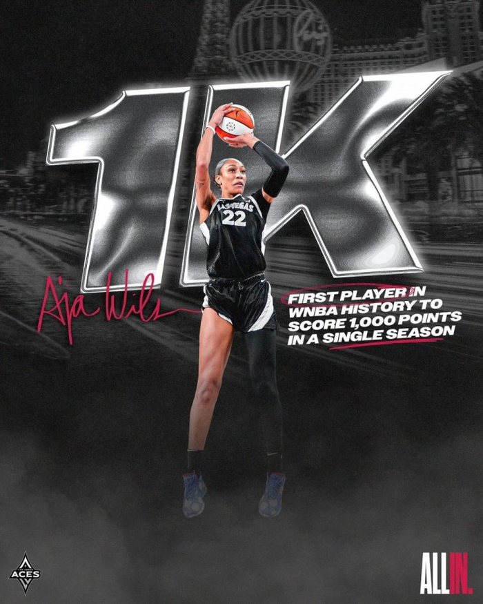 这样一来,阿贾-威尔逊本赛季总得分已经达到1000分(本场比赛前为971分),继续刷新WNBA历史单赛季得分纪录,并成为WNBA历史上首位单赛季得分破千的球员!