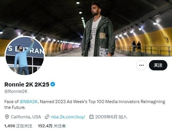 如今在Ronnie的个人社媒主页上,他给自己的称号是“NBA2K的门面”。