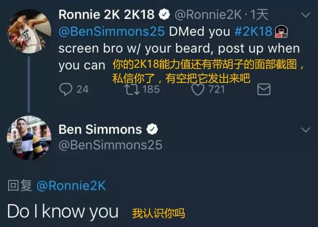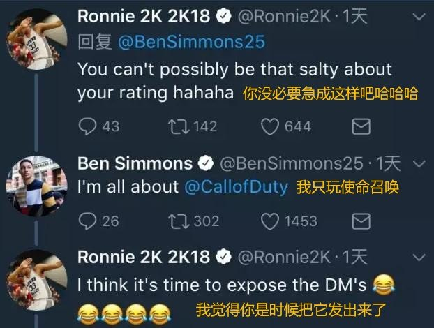 NBA2K18发布前,Ronnie曾经“命令”本-西蒙斯在社交媒体上发布自己的截图为游戏宣传。但西蒙斯根本懒得鸟他,还把Ronnie怼的无话可说......