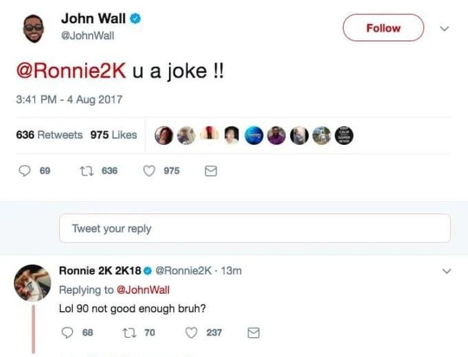 NBA2K18发布的时候,沃尔因为觉得自己能力值过低找Ronnie抱怨却被吐槽“笑死我了,90能力值还不够”。