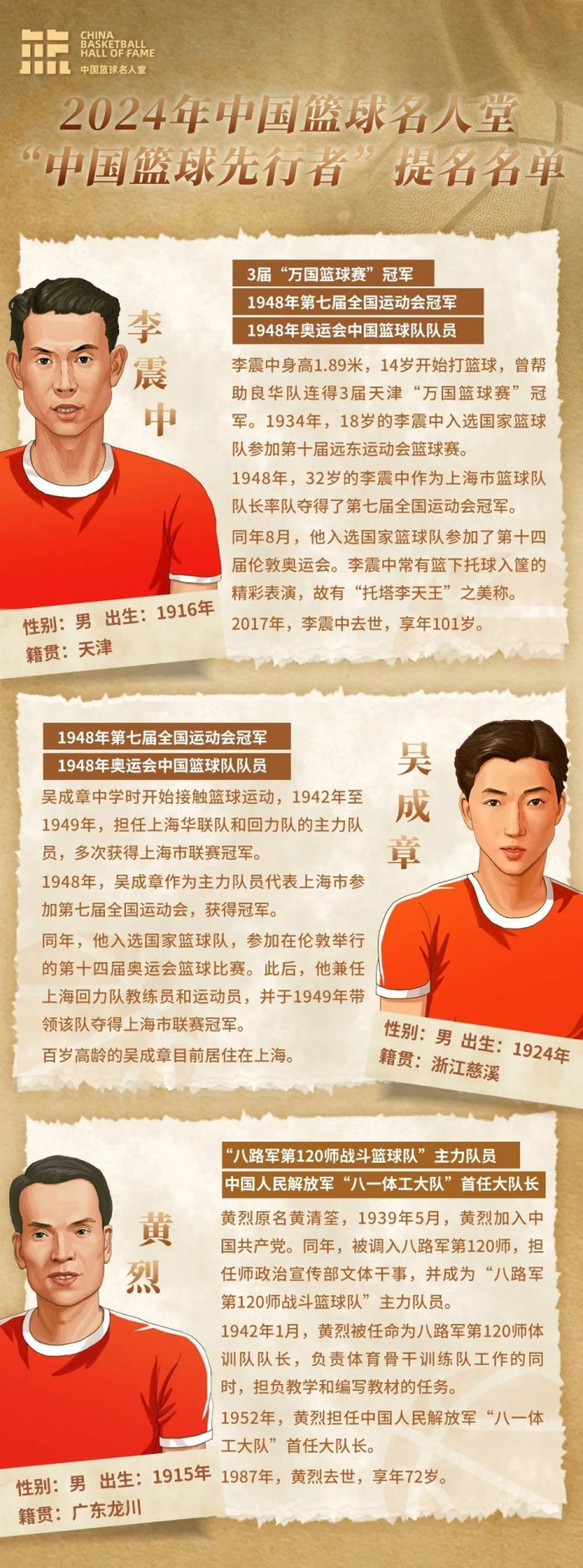 2024年中国篮球名人堂“中国篮球先行者”提名名单确定,获得提名的是:李震中、吴成章、黄烈。