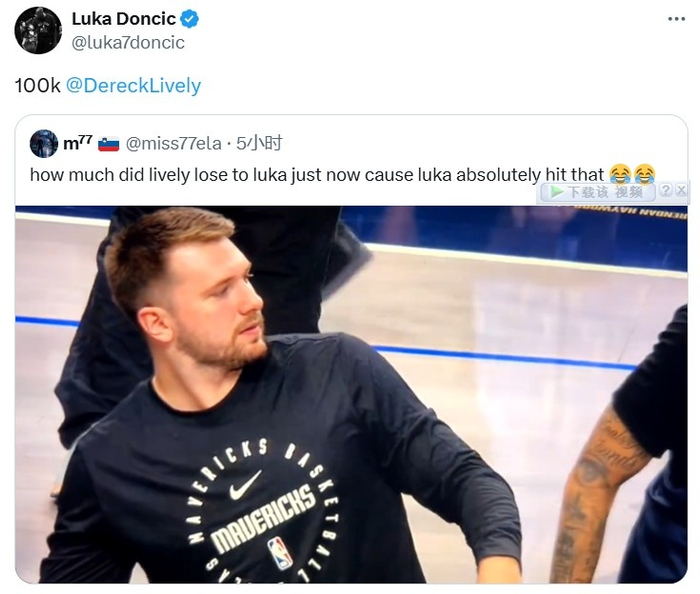 东契奇随后转发这粒进球视频,并在线问莱夫利“讨债”:10万@莱夫利!”