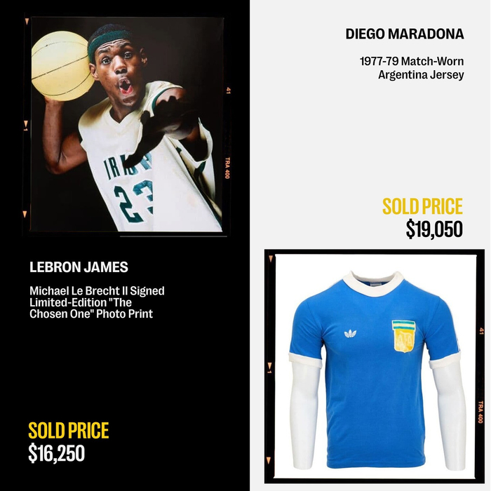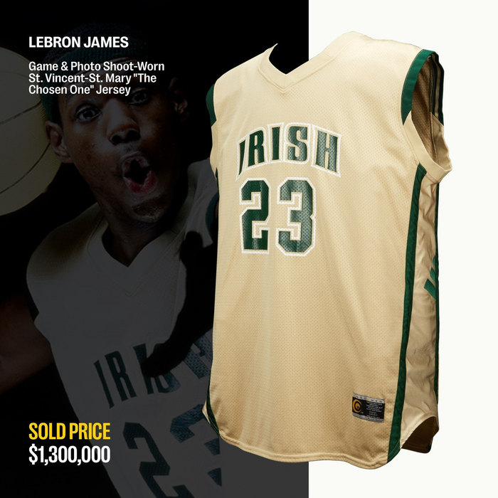 詹姆斯的“天选之子”球衣是这次特别拍卖会上售价最高的物品,本次拍卖会的其他拍品包括一个迈克尔-乔丹的签名篮球、C罗2018年欧冠决赛的球衣(7620美元)、梅西2022年世界杯对阵波兰的球衣(2275美元)、李小龙在1973年的电影《龙争虎斗》的洞穴打斗场景中使用的一对双节棍(190500美元)、泰勒-斯威夫特在2023年时代巡回演唱会中戴过的一顶签名软呢帽(22750美元)。