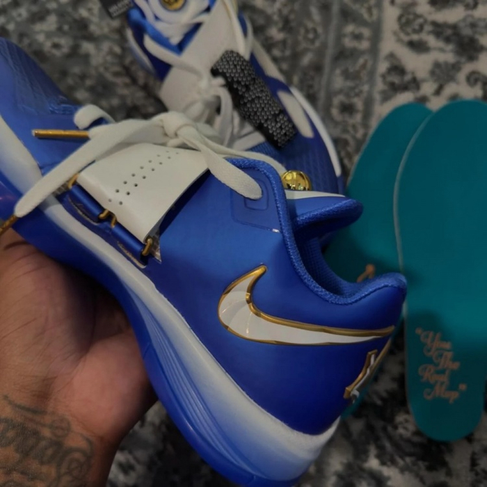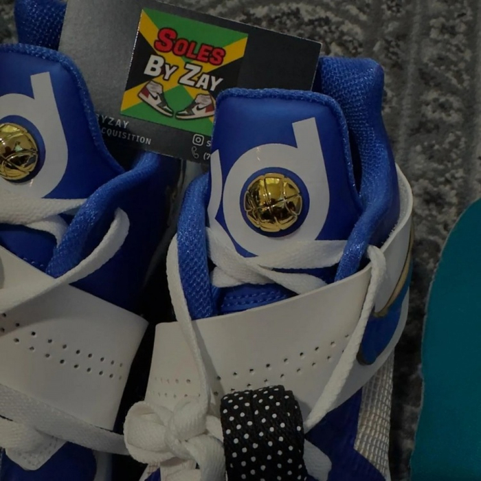 配色方面,经典的蓝白搭配来自雷霆,鞋面的网格造型如同篮网,鞋舌上装饰了一颗金色的篮球,象征着杜兰特的生涯荣誉,附赠的黑色波点鞋带呼应杜兰特演讲时所佩戴的领带。