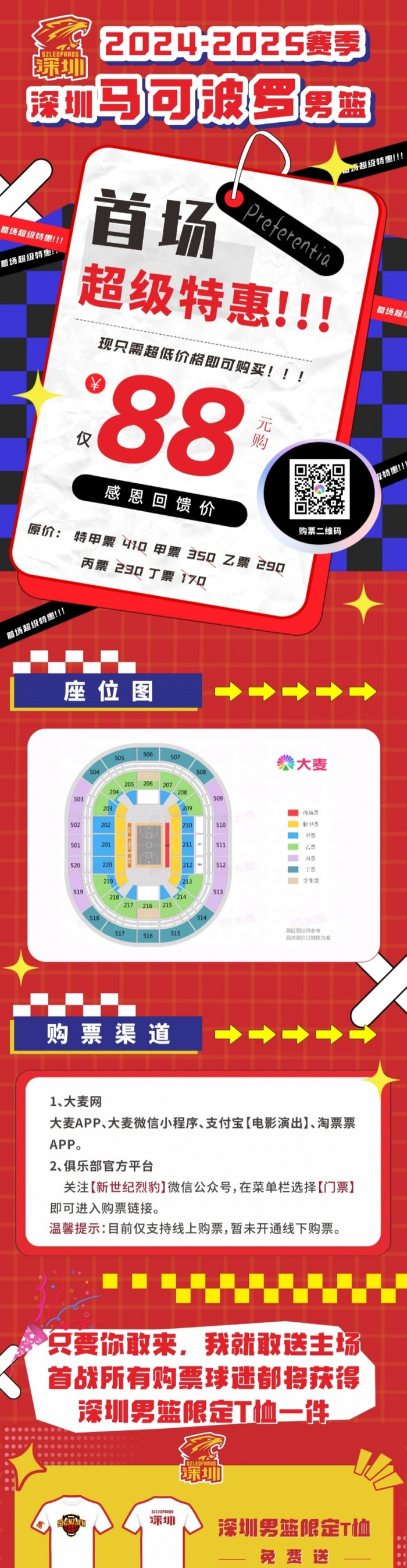 烈豹焕新,福利升级!只要你敢来,我就敢送!主场首战所有购票球迷都将,获得深圳男篮限定T恤一件。多重好礼现场抽!