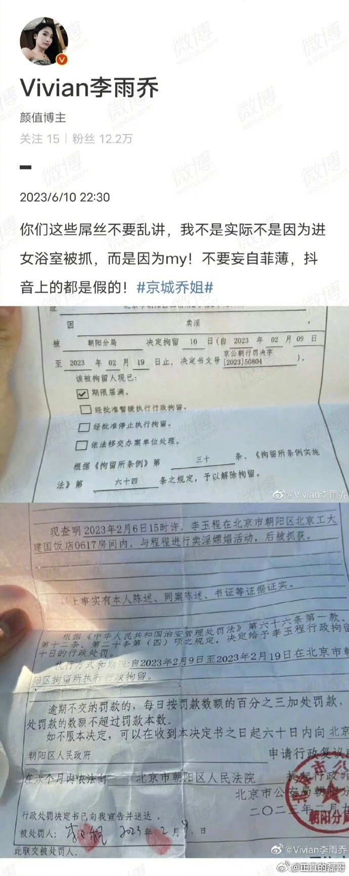 2023年2月,平安北京朝阳针对该“女主”有过一次通报,通报内容如下:
