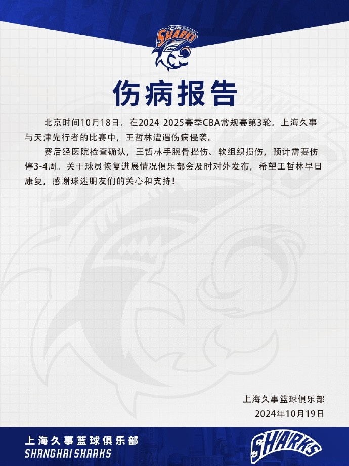 直播吧10月19日讯 今天,上海男篮官方公布了王哲林的伤病情况。原文如下: