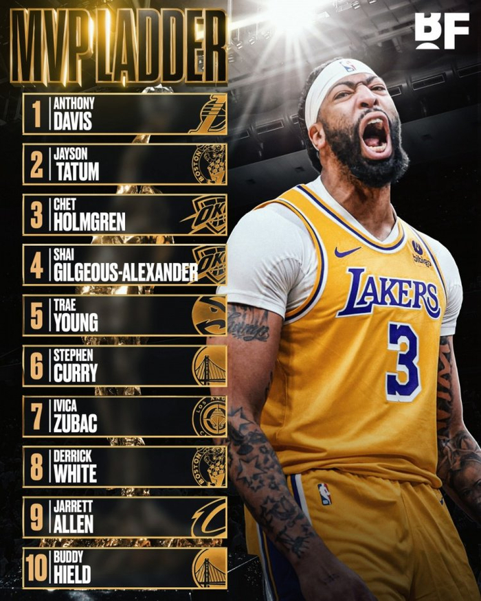 美媒开季至今MVP榜:浓眉居首 塔图姆2 库里6 祖巴茨7 希尔德10