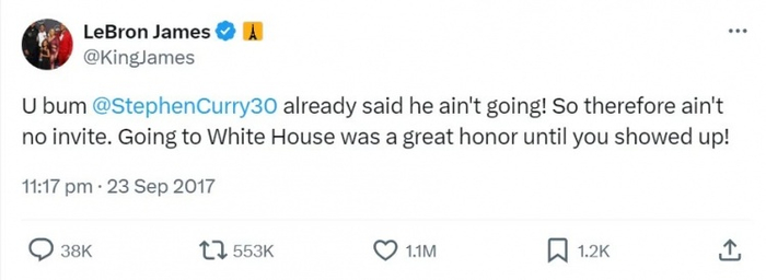 詹姆斯和特朗普的梁子越结越深。2017年勇士夺冠,史蒂芬-库里表态不想访问白宫,特朗普干脆撤回了对冠军队的邀请。詹姆斯在社交媒体上直接贴脸开大:“你这个白痴,库里已经说不会去,就别扯什么邀请了。在你出现之前,访问白宫是我莫大的荣幸。”这条推特最终获得119万次点赞和55万次转发,是当年最受欢迎的运动员推文。