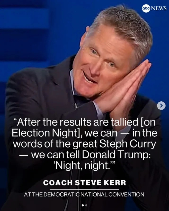 今年8月,科尔受邀在民主党全国代表大会上演讲,称特朗普会输掉大选,同时模仿了弟子库里著名的“晚安”手势,这个动作赢得了热烈的掌声,并在社交媒体上疯传。