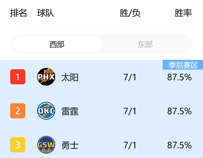 雷霆吞赛季首败!三队7-1!太阳升西部第1雷霆第2勇士第3!