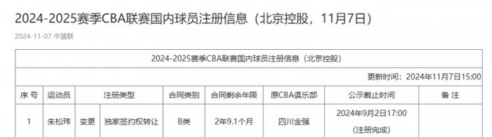 直播吧11月7日讯 CBA官网更新球员注册信息,北控新援朱松玮完成注册。
