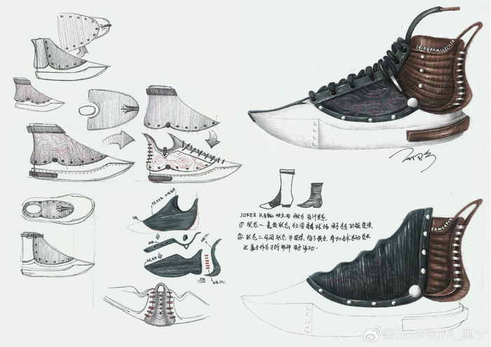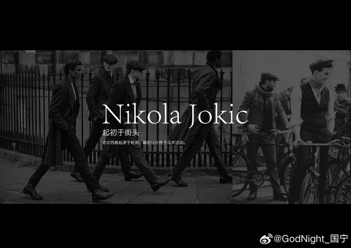 @GodNight_国宁写道:“有幸分享感谢大家。从前期接到项目,头脑里不断闪现出聚光灯下不断奔跑,马场上比赛飞驰的身影,鞋与人的形影不离,相得益彰。用全新的逻辑思维去设计这双鞋,新的设计语言,新的视觉,重新转化,以欧洲马术活动为主题,将马靴、切尔西靴融入设计,追求质感与手工的极致,打造多场景穿搭模式,去尝试更多可能性。打造只属于你自己的新篇章。Nikola Jokic”
