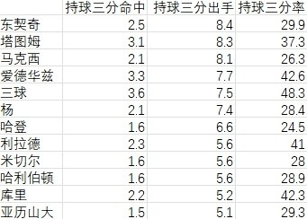 下一年,持球强拔三分球魁首不是库里了:哈登遇到了丹东尼,释放了三分之力,场均持球三分6.6投2.2中。其后是库里,以及场均5拔三分的威少:都知道威少三分没谱,但那年他是雷霆唯一持球手,刷三双之余,拔几个三分球吧。