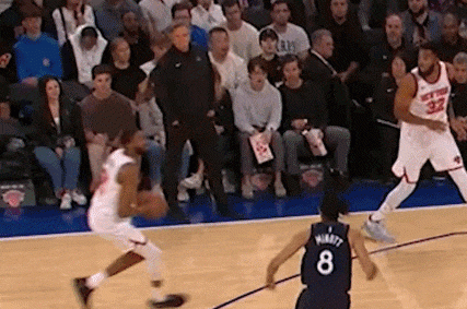 但实际上,以布伦森的比赛视角去看的话,重回五号位上的唐斯要对比的其实是无法挽回的哈滕斯泰因。尼克斯原以为,布伦森和唐斯的挡拆配合会成为非常高效且稳定的主打套路,但就像上赛季的利拉德和字母哥一样,很多幻想中的可能性在防守人轻松的挤过掩护时就破灭了,就像人们突然发现字母哥的掩护质量不够高、挂不住人一样,唐斯的掩护质量其实也不怎么高,很多时候,布伦森与唐斯之间的挡拆配合根本就无法直接创造出得分的空间或者是更主动的进攻机会。
