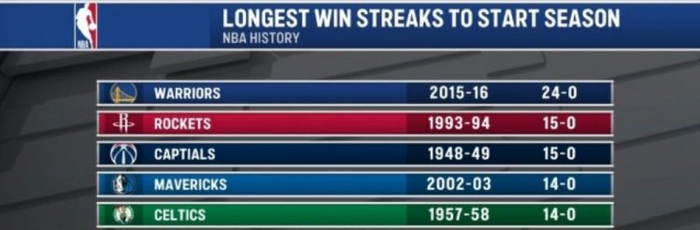 历史上13胜0负开局的五支球队 四支进总决赛 仅93-94赛季火箭夺冠
