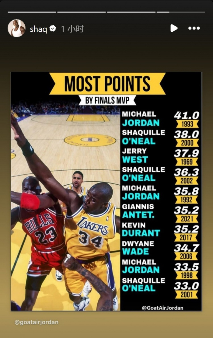 奥尼尔转发FMVP场均得分前10:93乔丹41分第1 自己第2 字母KD上榜