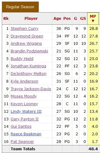 而勇士这边,随着休赛期的引援补充,球队阵容更加深厚,这也让科尔有资本排出超长轮换,一共有13名球员的场均出场时间超过10分钟,其中最长的库里也没有超过30分钟(这也是库里自2019-20赛季以来的最低值,生涯第二低)。