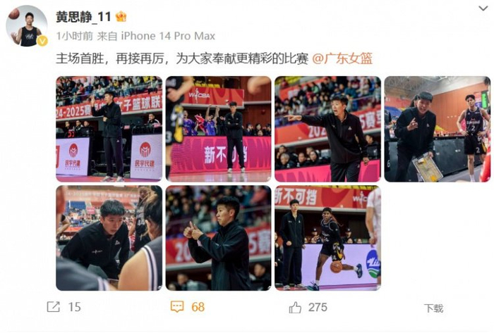 相当有范儿!广东主帅黄思静晒执教照:主场首胜 再接再厉