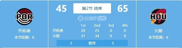 直播吧11月23日讯 NBA常规赛,火箭半场65-45领先开拓者。