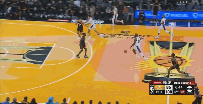 直播吧11月27日讯 湖人VS太阳杯赛末节,比尔在防守端追帽詹姆斯。