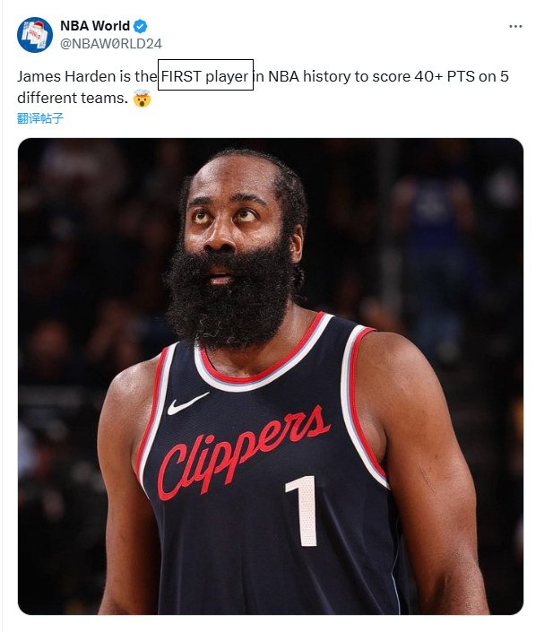 美媒NBA World表示,这是哈登快船生涯首次拿下40+,他也成为NBA历史上首位在5支不同球队都拿到过单场得分40+的球员——雷霆(常规赛)、火箭(常规赛、季后赛)、篮网(常规赛、季后赛)、76人(季后赛)、快船(常规赛)。