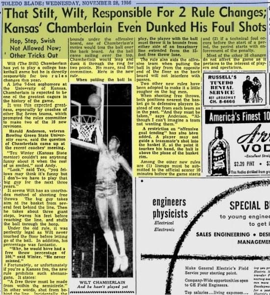 然而,我们在NCAA修改规则的官方纪录里并没有找到这一条,一个美国网友在发帖时指出,这条禁令只适用于堪萨斯大学所在的大七联盟(大十二联盟的前身),由于年代过于久远已经无法考证。不过可以确定的是,1956-57赛季NCAA修改了三条规则:第一,罚球线的宽度从6英尺扩大到12英尺;第二,重新规定了球员在罚球时的站位;第三,抓篮筐被定义违反体育道德的行为。