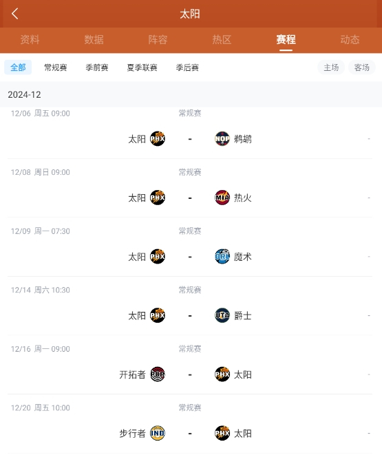 太阳未来两周的赛程如下: